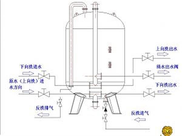 反洗:關掉滲水離心水泵,開啟閘閥c、b,關掉別的閘閥,開反洗離心水泵開展反洗,把水歷經過濾器底端,自下高于一切對氧化塔開展松脫1-2min,然后終止水清洗,開展氣洗3-5min,隨后再水氣另外反洗8-10min,最終水清洗2-3min,全部反洗全過程約20min。